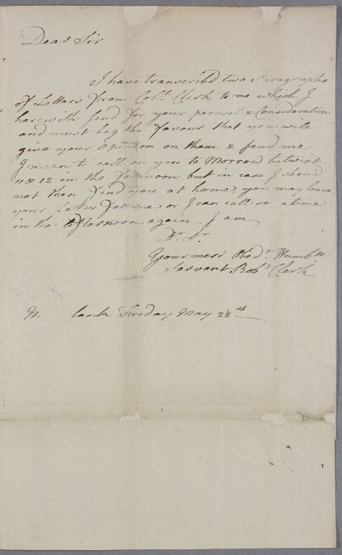 Letter from Robert Clark of Mavisbank. Covering letter for transcribed extracts of letters written to him by his brother, Colonel George Clerk (letters 2219 and 2220), and apparently delivered to Cullen in person. Year is certainly 1784 because 28 May is a Friday.