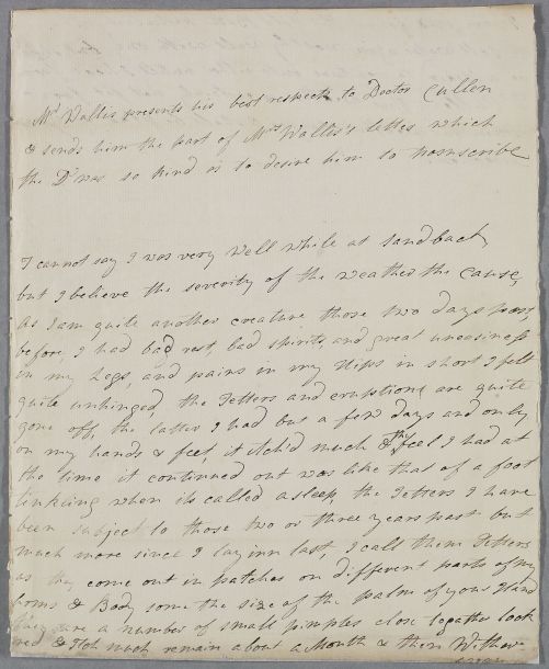 Copy of a letter from Mrs Wallis, describing her own case. The copy was made by Mr Wallis, of 'the part of Mrs Wallis's letter which the Dr was so kind as to desire him to transcribe' The letter refers to 'Sandback' as a place. Is it possibly 'Sandbank' which is a village in the Cowal Peninsula in Argyll, but not linked as uncertain.