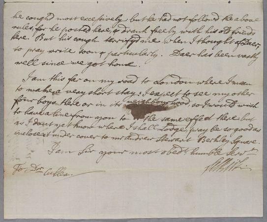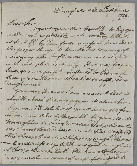 | Summary | Letter from the Earl of Selkirk concerning his son, Lord Daer, and his other children. He asks Cullen to write to Lady Selkirk at St Mary's Isle with advice on a 'way of managing the influenza'. |