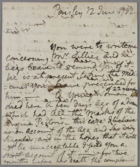 | Summary | Letter from Alexander Taylor, briefly noting that Mr Gillies is taking his medicines, and giving an account of the death and autopsy (post mortem) examination of a 22-year-old woman, a 'strong-made girl and of a chearful temper', whose disease 'had all the marks of the Angina Pectoris'. She had suffered from chest pains and faintness. He attributes her collapse to having been startled by a firework display, probably staged to celebrate Admiral Rodney's victory in the Battle of the Saintes, but her post mortem (by Taylor, Fulton and White) revealed carditis. |