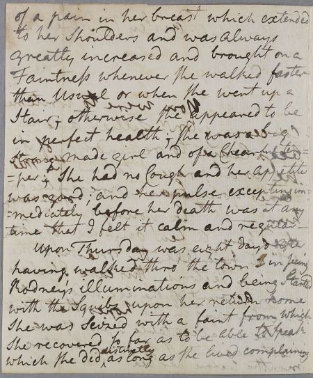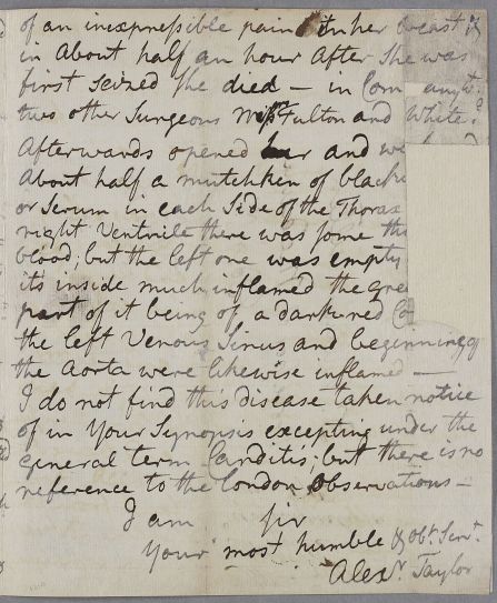 Letter from Alexander Taylor, briefly noting that Mr Gillies is taking his medicines, and giving an account of the death and autopsy (post mortem) examination of a 22-year-old woman, a 'strong-made girl and of a chearful temper', whose disease 'had all the marks of the Angina Pectoris'. She had suffered from chest pains and faintness. He attributes her collapse to having been startled by a firework display, probably staged to celebrate Admiral Rodney's victory in the Battle of the Saintes, but her post mortem (by Taylor, Fulton and White) revealed carditis.