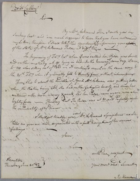 [ID:2239] From: Mr Joseph Hume / To: Dr William Cullen (Professor Cullen) / Regarding: Mrs Aikman (Patient) / 20 June 1782 / (Incoming)