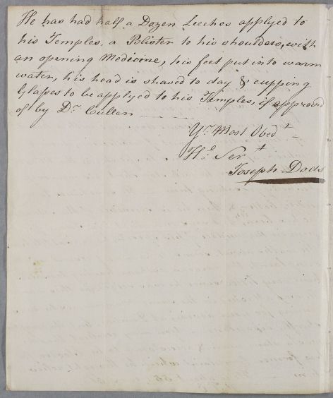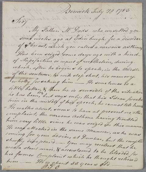 Letter from Joseph Dods, concerning the case of his father, who had been to visit Cullen a few weeks previously for 'nervous asthma'. Mr Dods, aged about 55, is now also suffering from bouts of stupor and loss of memory. His son asks Cullen's approval for a range of treatments such as leeches, cupping, blistering head-shaving and warm foot-baths.