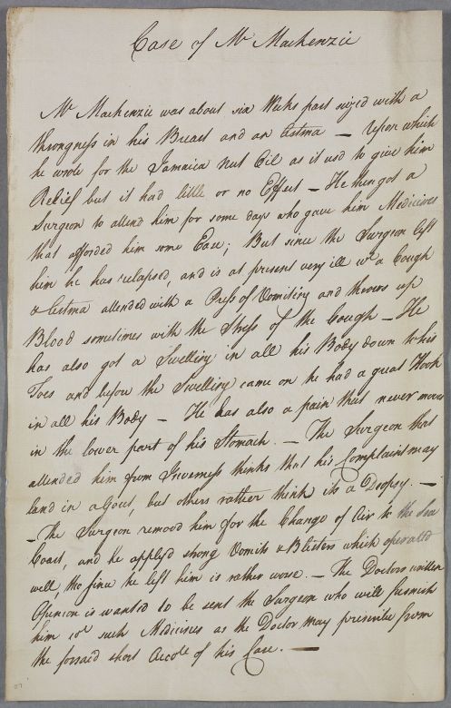 | Summary | Unsigned case note, concerning the case of Mr Mackenzie. This letter was enclosed by James Macleod and sent to Cullen along with document 2291. It supplies a more recent account of Mr Mackenzie's symptoms. Mr Mackenzie suffers from asthma and a 'pain that never moves in the lower part of his Stomach'. The latter symptom is attributed to gout by the surgeon from Inverness who attended him (likely referring James MacLeod). |
