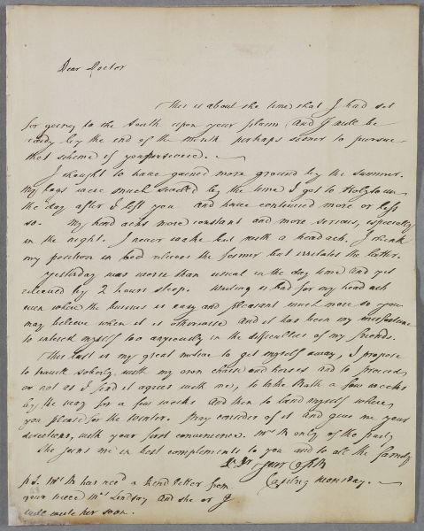 | Summary | Letter from Mr Robert Barclay, concerning his own case. Mr Barclay suffers from swollen legs and headaches. Writing and attending to business exacerbates the latter. He plans to journey south to England and to take in Bath on the way. |