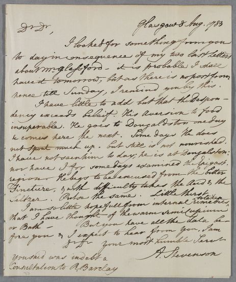 | Summary | Letter from Alexander Stevenson, concerning the case of Mr Glassford, who goes between Dougalston and Glasgow every few days. 'His aversion to food insuperable', and he is finding it difficult to take medication, so Stevenson wonders if using the semicupium or going to Bath might be more effective. He adds: 'You said was in debt a Consultation to R Barclay' (see details in footnote). |