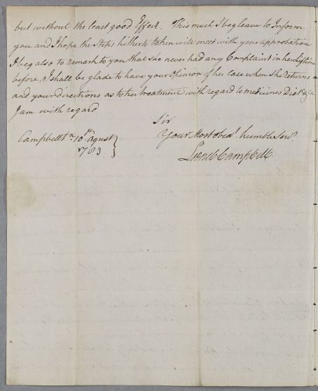 [ID:2299] From: Mr Lionel Campbell / To: Dr William Cullen (Professor Cullen) / Regarding: Miss Campbell (of Saddle) (Patient) / 10 August 1783 / (Incoming)