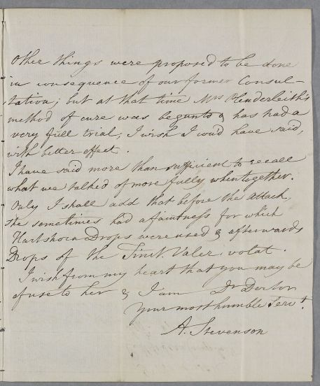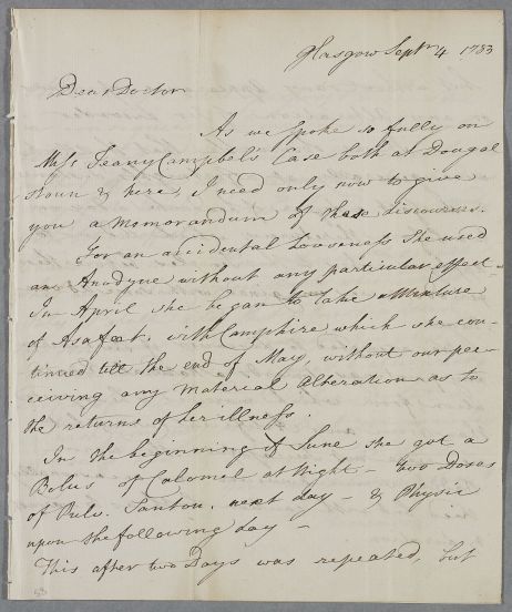 | Summary | Letter from A. Stevenson concerning Miss Jeany Campbel, whose case he discussed with Cullen 'both at Dougalstoun & here [Glasgow]'. |