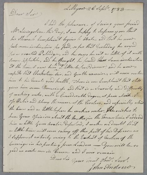 | Summary | Letter from John Andrew, concerning the case of 'your freind Mr Livingston'. The patient's condition seems to be improving, and his appetite has returned 'so far that yesterday he cryed out for a roasted Patridge'. |