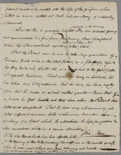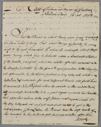 | Summary | Case note titled 'Case of J Adam at Manse of Cushnie Aberdeen Shire' whose health first collapsed in the West Indies. The case refers to Colica Pictona or dry belly ache' which is a form of environmental lead poisoning common in the West Indies at the time. |