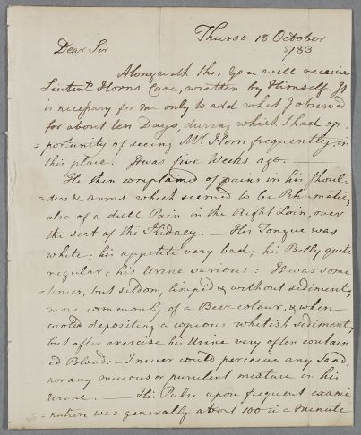 Case of Lieutenant William Horne, who visits Cullen from Ireland in April 1782 to seek advice for a long-standing disorder characterised by pains around his kidney and sediment in his urine and for which he seeks advice again in October 1783. |
