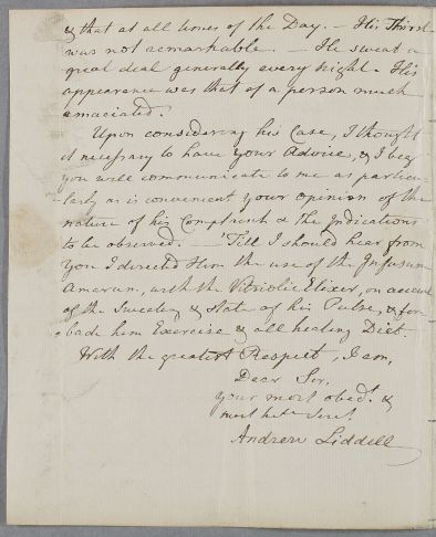 | Summary | Letter from Andrew Liddell, concerning the case of Lieutenant William Horne. Covering letter for an account written by the patient which is Doc [ID:2344] . |