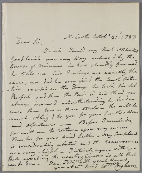 | Summary | Letter from William Ingham, concerning the case of Mr Wallis, whose condition has remained unchanged despite the course of medicine he has 'steadily pursued', with a concluding comment on his own case. |