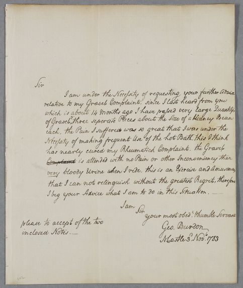 | Summary | Letter from George Burdon, concerning his own case 'relative to my Gravel Complaint'. Since his last letter, Mr Burdon has 'passed very large Quantitys of Gravel'. |