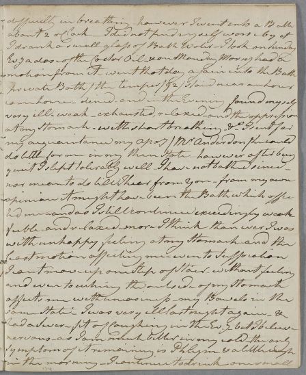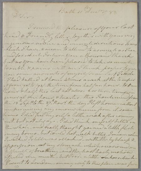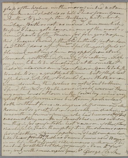 | Summary | Letter from Colonel George Clerk, concerning his own case. He describes how he has fared since coming to Bath to take the waters. He is still suffering from breathlessness and flatulent oppression of his stomach and bowels, and is being attended by a local apothecary, Mr Anderdon. |