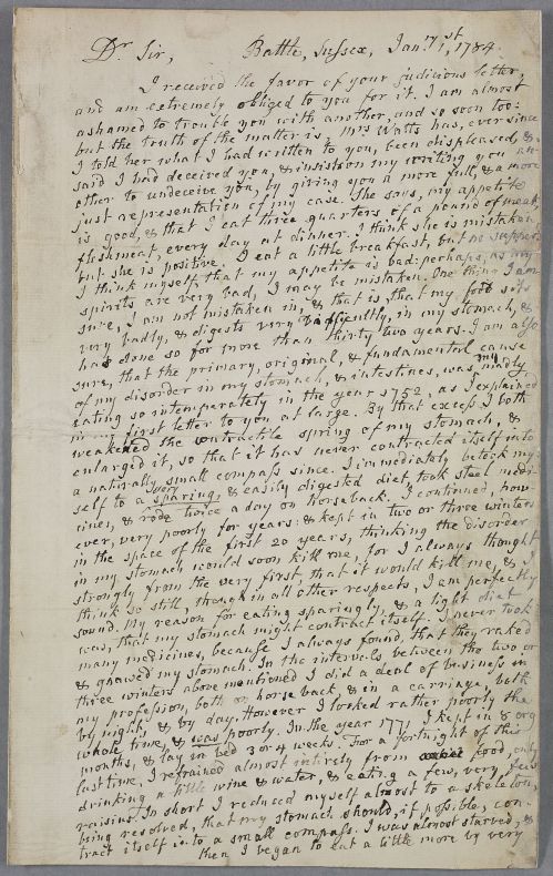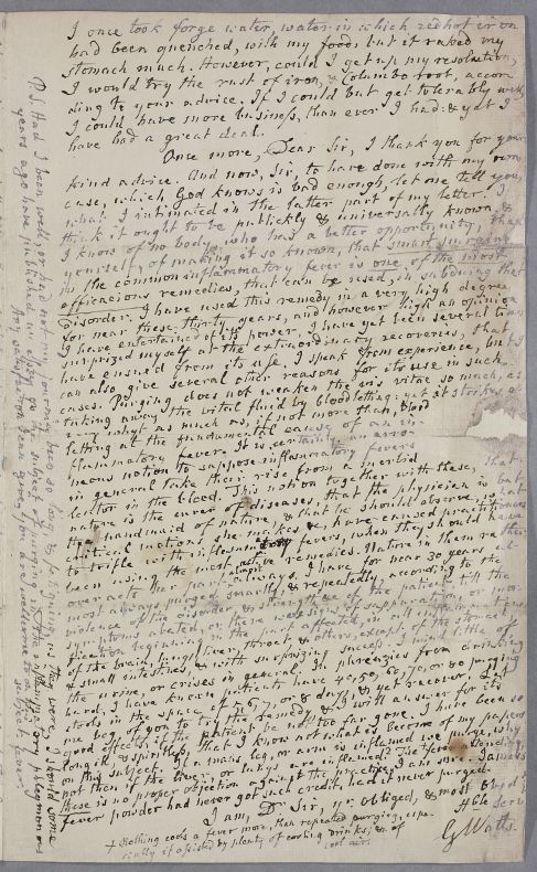 | Summary | Letter from G. Watts, concerning his own case. Dated '1784' in error for "1785" (or Watt was using the old calender system). He is also a doctor, and writes about the use of purging as the most efficacious remedy in the common inflammatory fever. |
