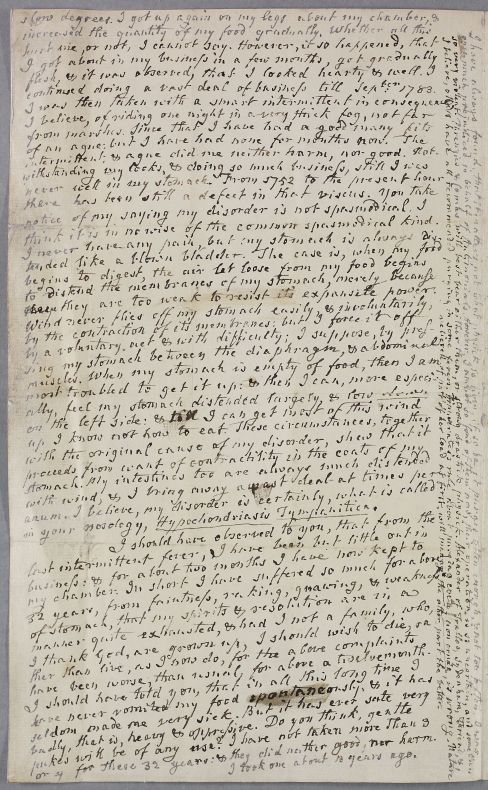 Letter from G. Watts, concerning his own case. Dated '1784' in error for "1785" (or Watt was using the old calender system). He is also a doctor, and writes about the use of purging as the most efficacious remedy in the common inflammatory fever.