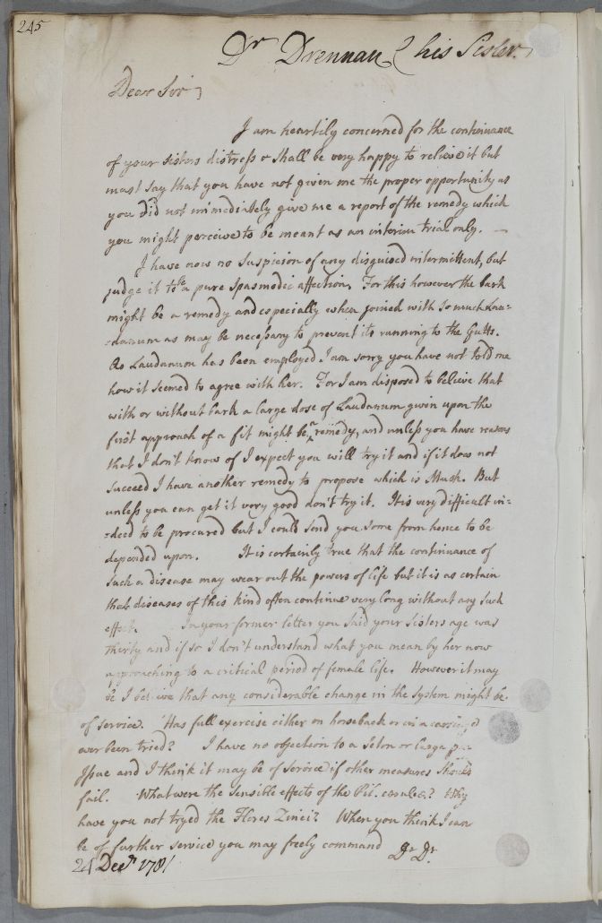 | Summary | Reply, for 'Dr Drennan C(oncerning) his Sister'. |
