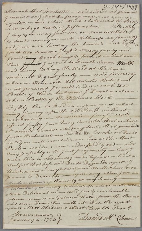 [ID:2390] From: Mr David Maclean (Mclean, McClean) / To: Dr William Cullen (Professor Cullen) / Regarding: Mr David Maclean (Mclean, McClean) (Patient) / 4 January 1784 / (Incoming)