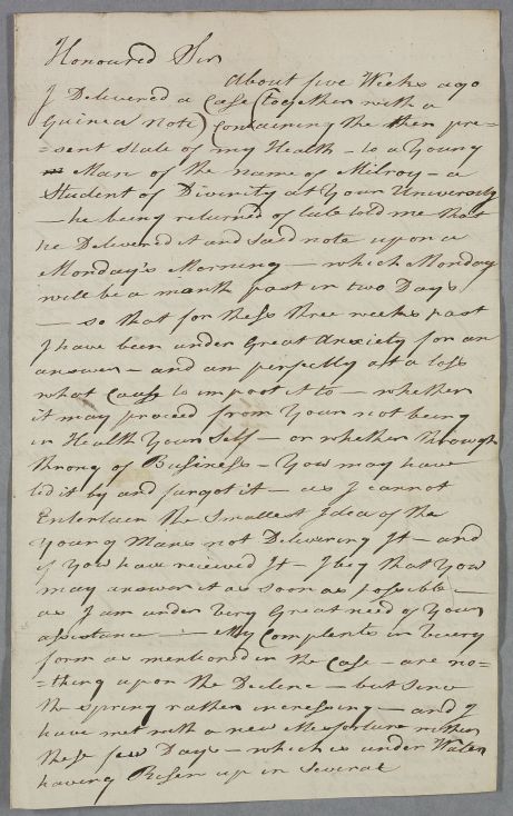 | Summary | Letter from David McClean, concerning his own case. He also mentions that he has had no reply to his previous letter to Cullen, and has 'been under Great Anxiety for an answer'. |