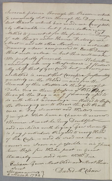 Case of David McLean who sends a very long account of his various 'nervous' symptoms following an injury to his foot; later, in 1784, he contacts Cullen again over the ill-effects of living in a damp house. |