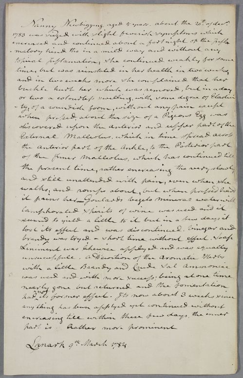 Case of Nancy ['Nanny'] Newbigging, a five year old child who has had a fever and now has a swelling on her foot. |