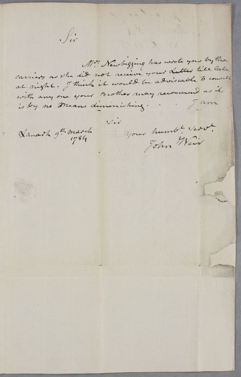 [ID:2413] From: John Weir / To: Mr Robert Newbigging / Regarding: Miss Nancy Newbigging (Nanny) (Patient) / 9 March 1784 / (Incoming)