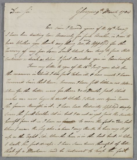 | Summary | Letter from David Hamilton, who has previously consulted Cullen in Edinburgh, and is still finding no real relief for his lameness from either fomentations or electricity. He wonders 'if a Machine cou'd be contrived to keep the foot from drooping it wou'd assist me greatly in Walking'. |