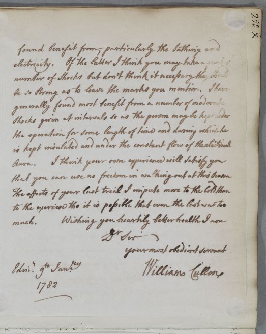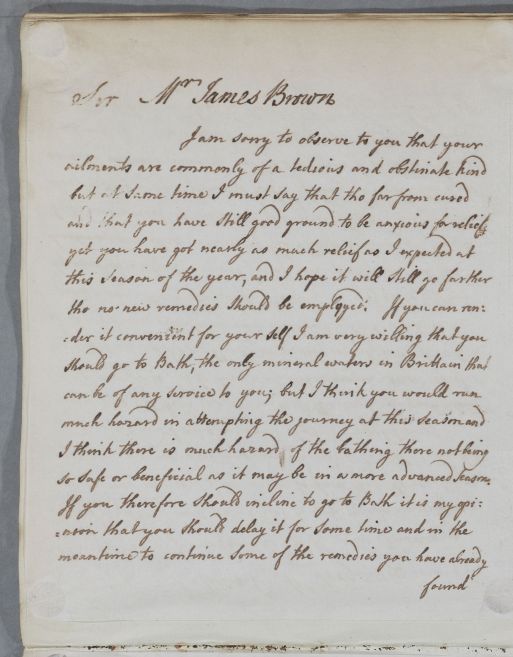 | Summary | Reply to Mr James Brown, discussing whether going to Bath would be helpful for his illness, and advising on the use of electrity: 'I think you may take a greater number of shocks but don't think it necessary they should be so strong as to leave the marks you mention'. |