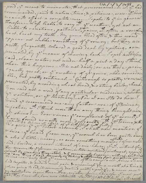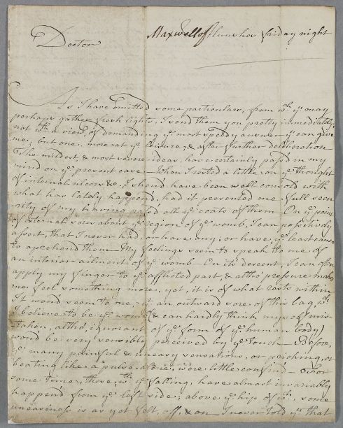 Case of Mrs Maxwell of Munches [Munchies] whose symptoms are attributed to 'a weakness of the womb'; she is later considered a 'nervous' case. Cullen's replies refer to a number of incoming letters which are untraced. |