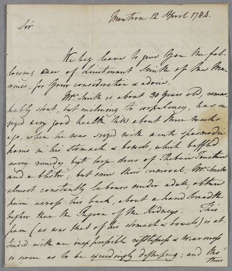 [ID:2441] From: Dr James Ross / To: Dr William Cullen (Professor Cullen) / Regarding: Lieutenant Smith (Patient) / 12 April 1784 / (Incoming)