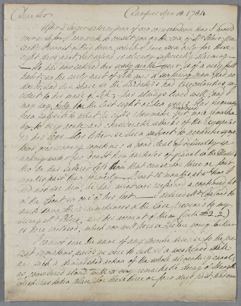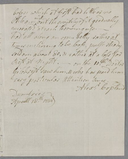 [ID:2447] From: Dr John Gilchrist (of Speddoch) / To: Dr William Cullen (Professor Cullen) / Regarding: Provost David Blair (Patient) / 18 April 1784 / (Incoming)