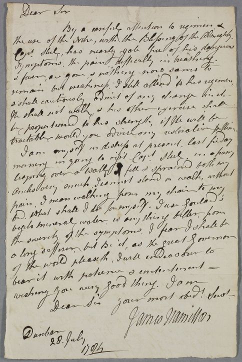 | Summary | Letter from James Hamilton, concerning the case of Captain Steel, who 'By a careful attention to regimen & the use of the Nitre, with the Blessing of the Almighty [...] has nearly got free of his dangerous symptoms'. He also mentions his own case: Hamilton has sprained both his ankles 'leaping over a wall' in a hurry to visit Captain Steel, and is barely able to walk. Cullen notes a suggested treatment, and a list of names on the reverse, the significance of which is unclear. |