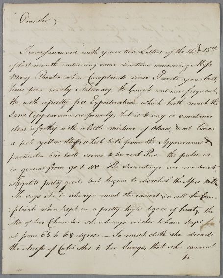 | Summary | Letter from William Wightman, concerning the case of Miss Mary Renton, 'whose Complaints since I wrote you last, have been nearly Stationary'. |