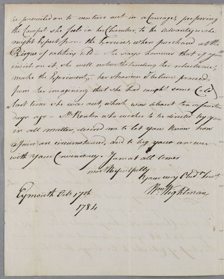 Letter from William Wightman, concerning the case of Miss Mary Renton, 'whose Complaints since I wrote you last, have been nearly Stationary'.
