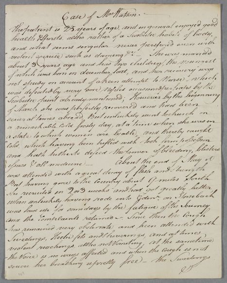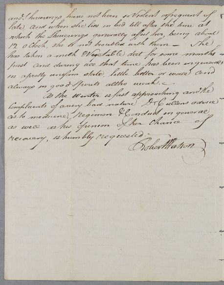 | Summary | Case note by Robert Watson, describing the case of Mrs Watson (presumably his wife), aged 25 and 'of a Scorbutic habit of body', who caught cold 3 months after giving birth. She then suffered a relapse after riding to Edinburgh (their country home is about 9 miles south of town), and suffers from bouts of cough, shivering, sweating and retching. The letter is annotated 'October', but as Cullen responded to it on 30 September, it must be dated a few days earlier. |