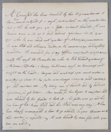 | Summary | Unsigned case note describing the case of Mr George Crawford, who has 'been o[b]served by his acquaintances to have been much subject to a cough particularly in the winter time but of this he will give you a better account himself'. |