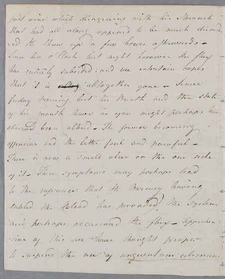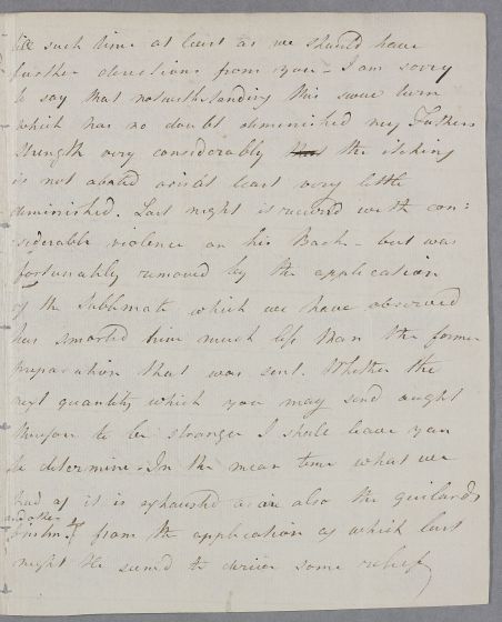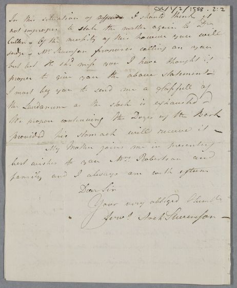 | Summary | Letter from Archibald Stevenson to Colin Robertsone, concerning the case of Archibald's father, the Reverend Mr Stevenson. Mr Stevenson had been weakened by a flux, which abated with the combined use of laudanum and powders (identified in letter 2538). Mr Stevenson's skin complaints continue. He has left off the use of the citrinum as it is believed the mercury entered his blood and caused the flux. The sublimate ointment, however, yielded better effects. |