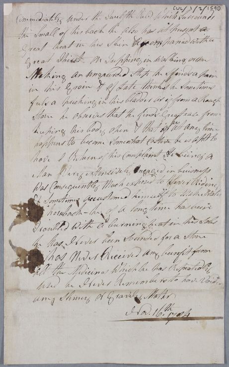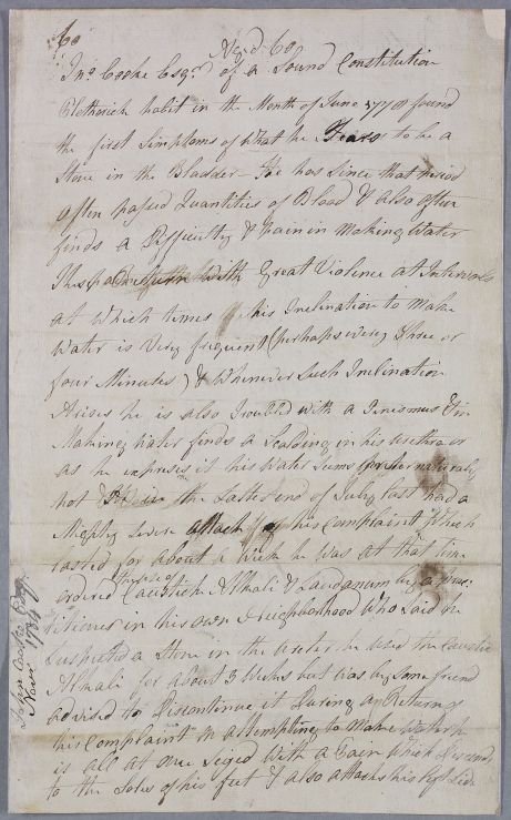| Summary | Case note from Dr Charles Keith concerning 'John Cooke, Esqr.', aged 60, who has a urinary tract ailment, suspected to be caused by a bladder stone. |