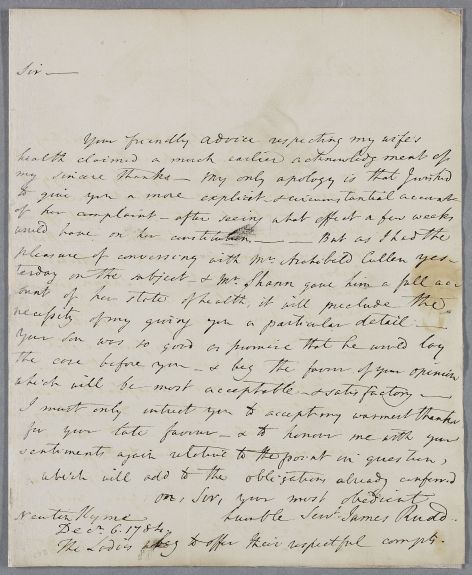 [ID:2548] From: Reverend James Rudd / To: Dr William Cullen (Professor Cullen) / Regarding: Mrs Elizabeth Rudd (Sutherland) (Patient) / 6 December 1784 / (Incoming)