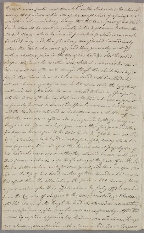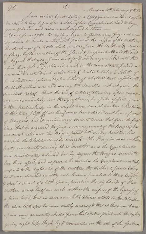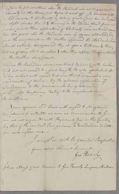 | Summary | Letter from George French, concerning the case of Rev. Ogilvy, a clergyman, originally from Angus, who has a urinary tract ailment. French believes it may be connected with a head injury he had suffered a couple of decades previously, which had led to chronic headaches and electrical treatment. |