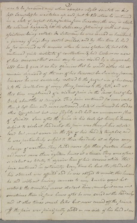 Letter from George French, concerning the case of Rev. Ogilvy, a clergyman, originally from Angus, who has a urinary tract ailment. French believes it may be connected with a head injury he had suffered a couple of decades previously, which had led to chronic headaches and electrical treatment.