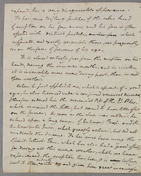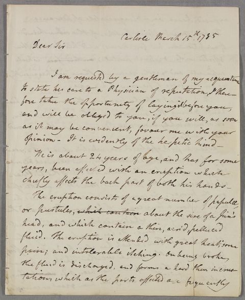 Letter from John Heysham, concerning the case of an unnamed male patient who has 'for some years, been affected with an eruption which chiefly affects the back part of both his hands'.