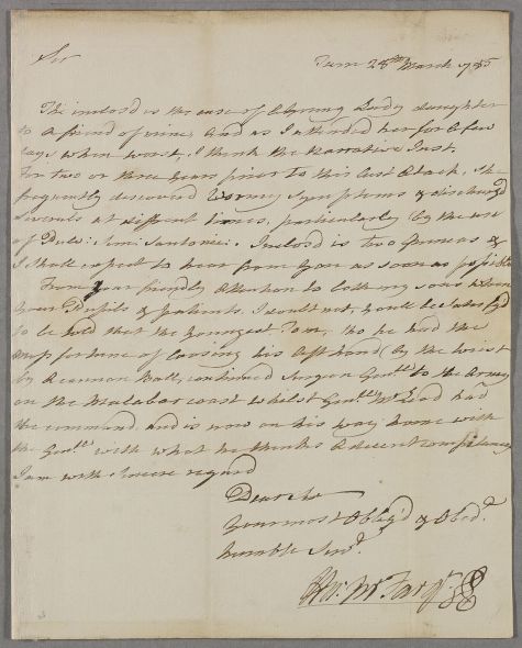 | Summary | Letter from John McFarquhar. Covering letter for a case note by Daniel Forbes describing the case of Miss Mary Baillie. McFarquhar writes of his younger son Tom, who was a student of Cullen's, and is now the surgeon general to the army on the Malabar coast of India, although he has lost his left hand from a cannon ball. |
