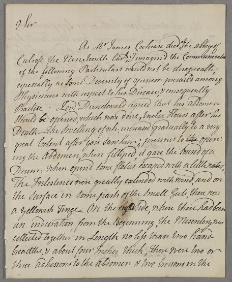 | Summary | Letter from James Whytt, reporting the death of James Cochrane at Culross Abbey House on 19 March, and giving an account of the post mortem carried out on the authority of Lord Dundonald. The letter may be dated early April, as he refers to the child's death as taking place on 'the Nineteenth Ult(imo)'. |