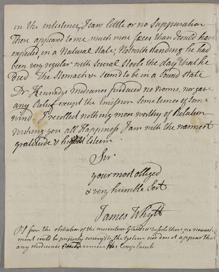 Letter from James Whytt, reporting the death of James Cochrane at Culross Abbey House on 19 March, and giving an account of the post mortem carried out on the authority of Lord Dundonald. The letter may be dated early April, as he refers to the child's death as taking place on 'the Nineteenth Ult(imo)'.