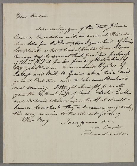 | Summary | Letter from Lord Dundonald, from unknown location (possibly London area, where his wife had died in November 1784)), probably to his late wife's mother, Mrs Gilchrist, and concerning the case of 'Jamie', his son. He mentions Cullen and Mr Wood being with the patient. Enclosed with Doc ID 2570 (which is dated 6 March) by his brother Alexander. |