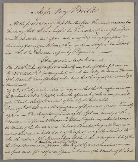 [ID:2600] Case Note / Regarding: Miss Mary Baillie (Patient) / 12 April 1785 / (Incoming)