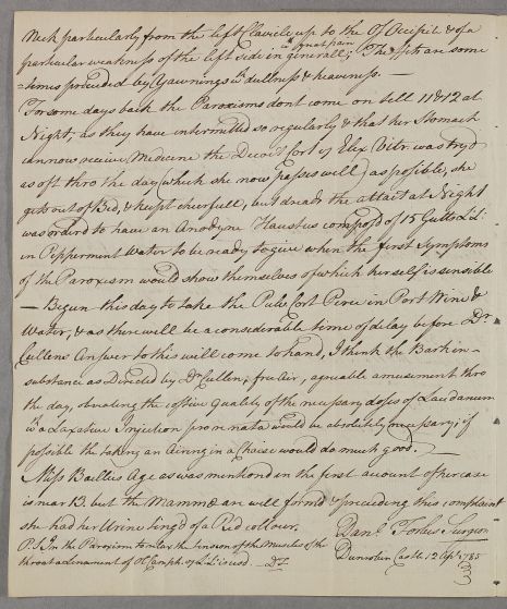 | Summary | Case note by Daniel Forbes, surgeon, concerning the case of Miss Mary Baillie, enclosed in related letter of the 15th. |