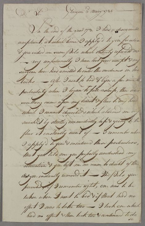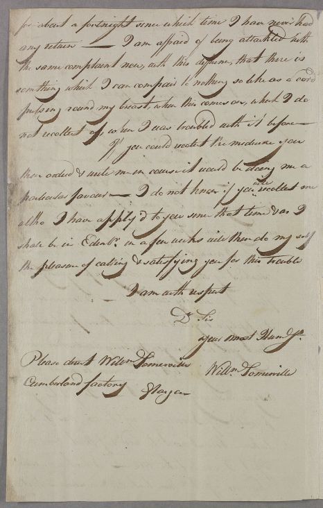 Case of William Somerville who has lost the recipe Cullen provided in 1773 which relieved the problem he had with vomiting when recumbent which he fears is returning. No trace of earlier communications. |